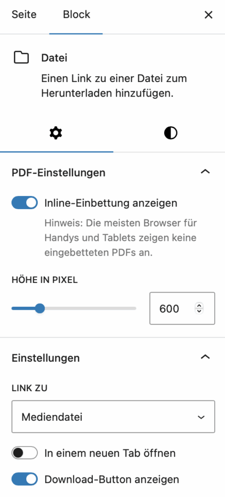 –> Zudem kannst du einstellen, ob sich der Link in einem neuen Browser-Tab öffnen soll. - Der Download-Button erscheint automatisch neben dem Dateinamen, um Besucher das Herunterladen zu erleichtern