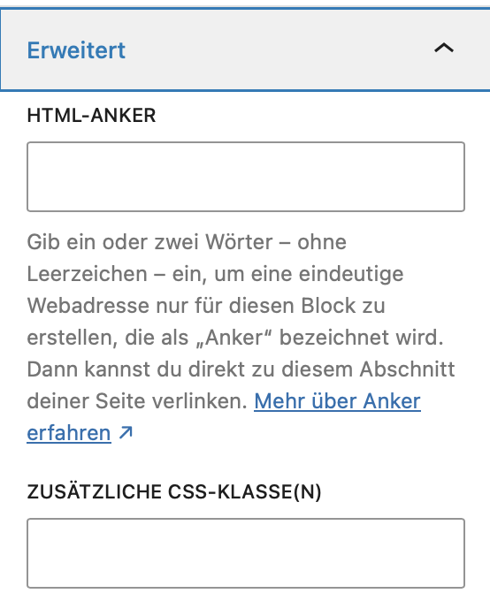 Im Abschnitt „Erweitert“ kannst du einen HTML-Anker sowie eigene CSS-Klassen hinzufügen.